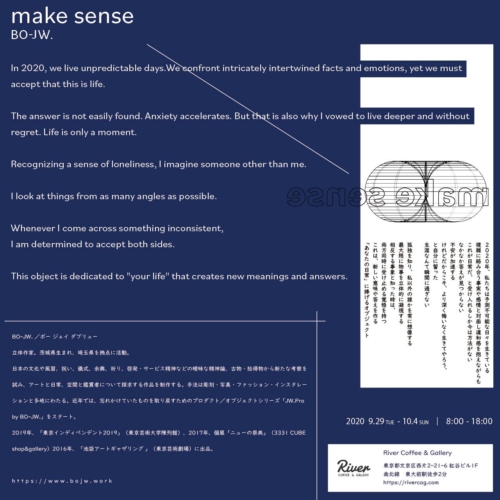 当企画は2018年よりスタートしたプロジェクトJW.Pro by BO-JW.の2020 Collection「make sense」のためのアートワークを中心に、2020年自粛期間、自身の生活を陰で支えてくれた立体コレクション、オブジェ、用途不明な物を織り交ぜ展開します。